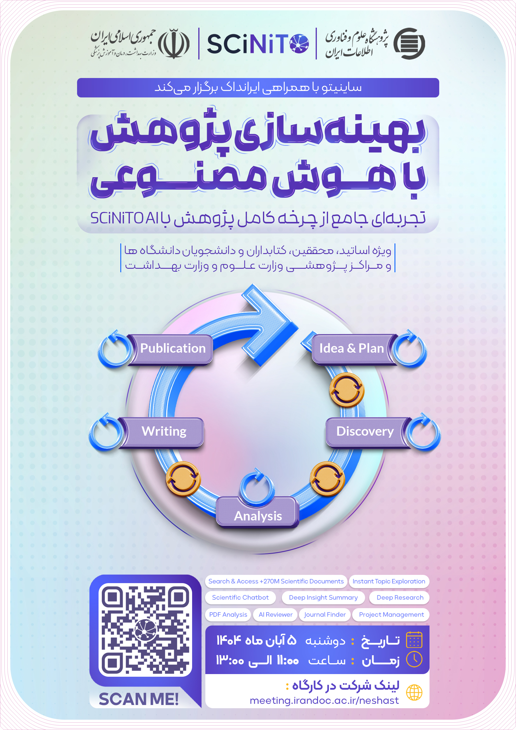 دسترسی آزمایشی کاربران دانشگاههای تابعه وزارت علوم، تحقیقات و فناوری به پلتفرم پژوهشی SCINITO.ai برقرار گردیده است. بدین منظور کارگاه معرفی و آموزش این پلتفرم با هدف آشنایی کاربران با قابلیتهای جستوجو و بهرهمندی از خدمات پژوهشی این سامانه در روز دوشنبه 5 آبان ماه 1404 از ساعت 11 الی 13 به صورت مجازی از طریق نشانی https://meeting.irandoc.ac.ir/neshast برگزار میگردد.