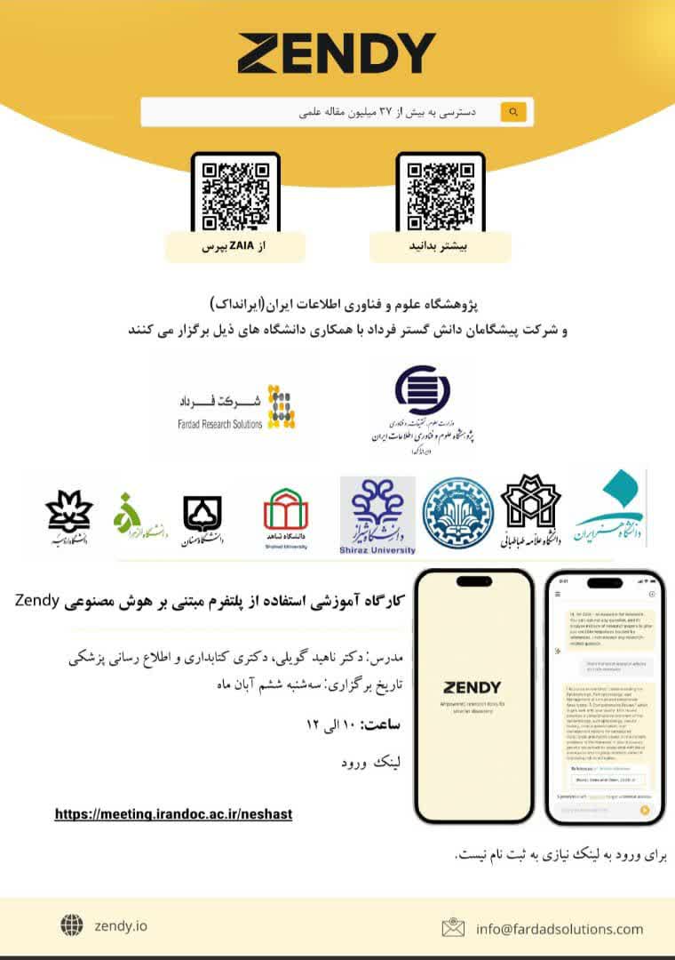 دسترسی کاربران دانشگاه به پلتفرم پژوهشی zendy و ابزارهای هوش مصنوعی آن با هدف تسهیل پژوهش و ارائه ابزارهای پیشرفته مبتنی بر هوش مصنوعی فراهم شده است.